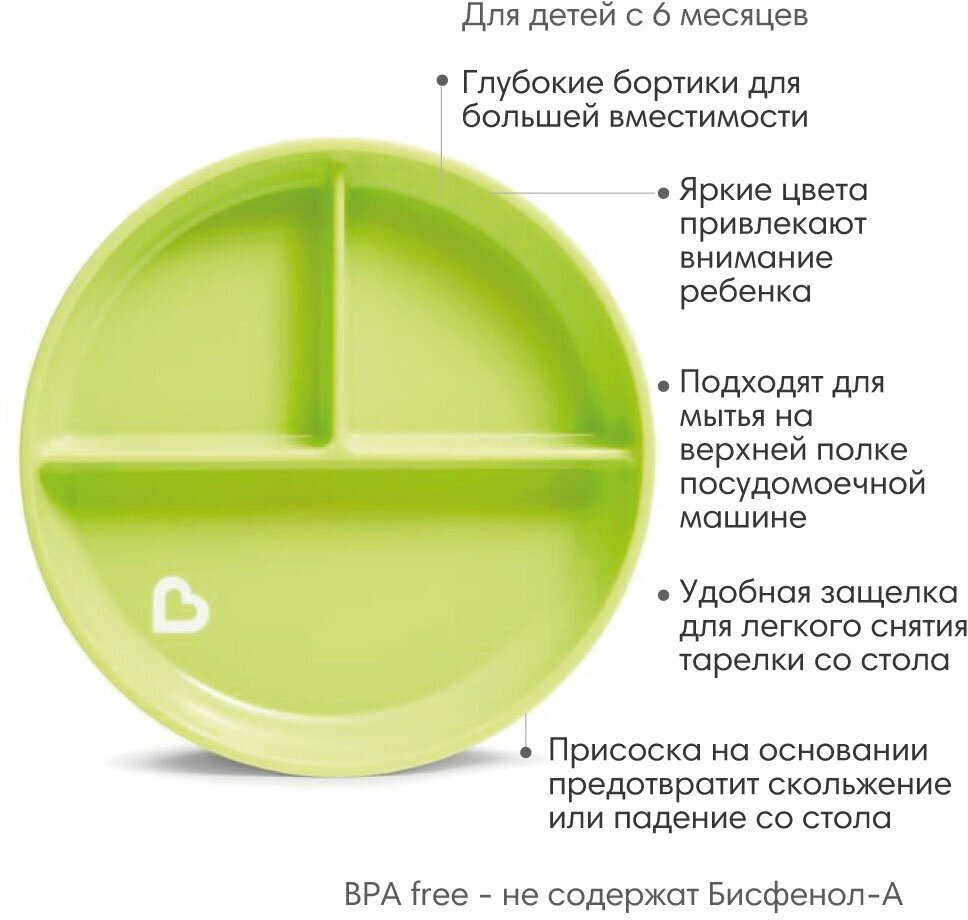 Тарелка детская на присоске секционная Munchkin, Stay Put™ нежно-зеленый, 6+ мес. информация:
