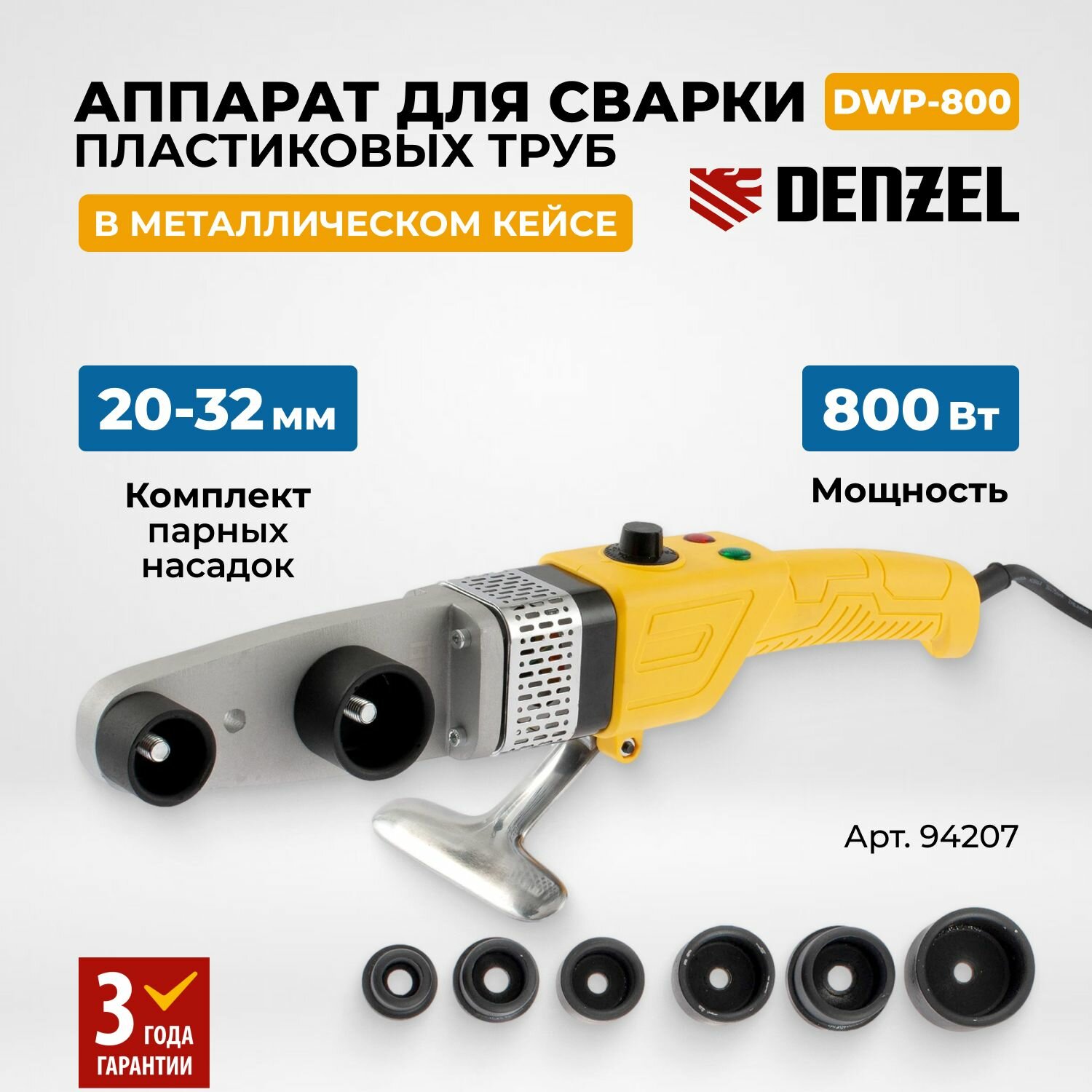 Аппарат для сварки пластиковых труб DWP-800, Х-Pro, 800 Вт, 300 град, комплект насадок, 20-32 мм Denzel 94207 информация: