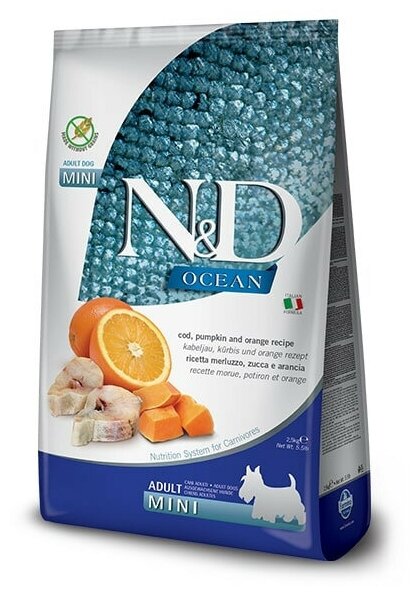 Фармина 36520 N&D OCEAN Adult Mini корм беззерновой для собак мелких пород с Треской, тыквой и апельcином 2,5кг