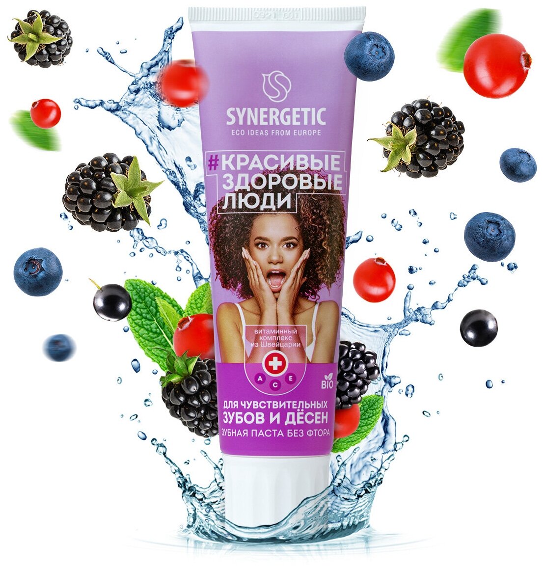Зубная паста SYNERGETIC Для чувствительных зубов и дёсен "ягоды + мята" натуральная, без фтора, 100г
