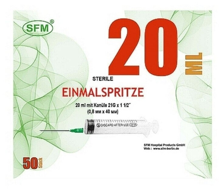 Шприц 20 мл. (3-х) SFM, Германия одноразовый стерилизованный с иглой 0,80 х 40 - 21G (блистер) 50 шт.