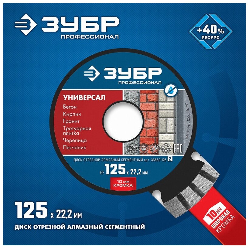 ЗУБР универсал 125 мм, диск алмазный отрезной по бетону, кирпичу, граниту, тротуарной плитке (125х22.2 мм, 10х2.4 мм), , серия Профессионал (36650-125_z02)