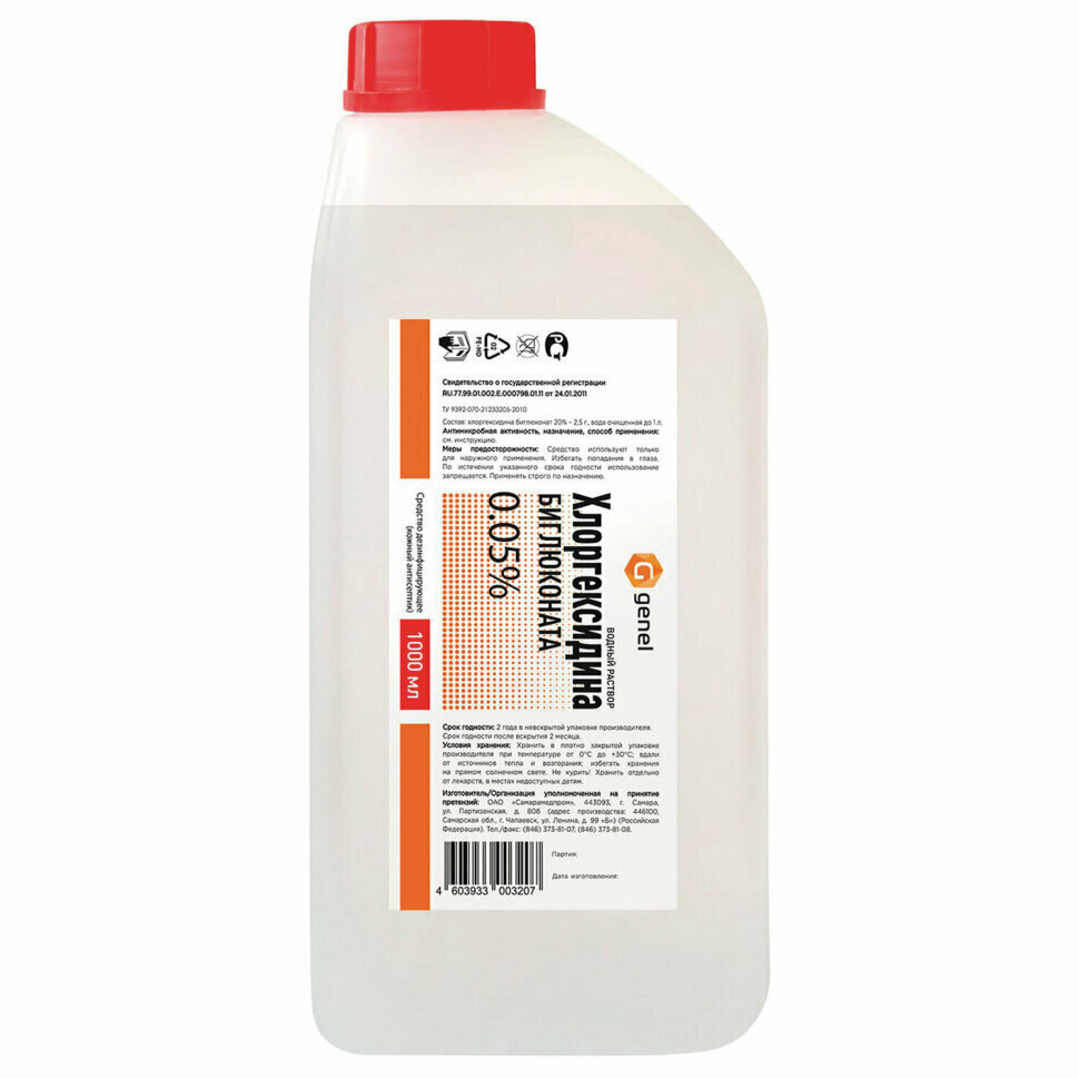 Genel средство дезинфицирующее (кожный антисептик) Водный раствор хлоргексидина биглюконата 0,05%, 1000 мл, тип крышки: винтовая информация: