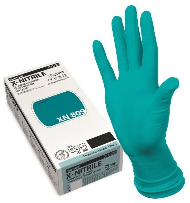 Перчатки нитриловые повышенной прочности с удлиненной манжетой Manual XN 809 сине-зеленый (25 пар, XL) 845 ₽