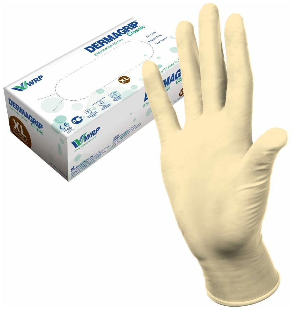 Перчатки латексные смотровые WRP Dermagrip Classic, 50 пар/100 штук, размер: M, цвет: светло-желтый