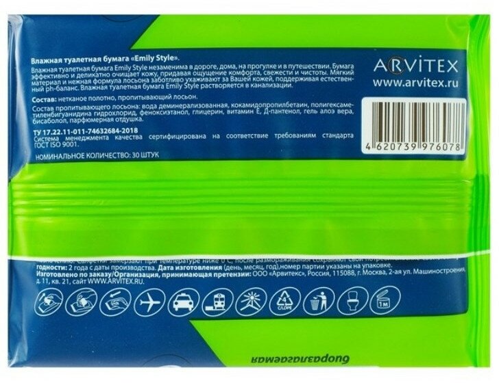 Бумага туалетная влажная Emily Style, 30 листов информация: