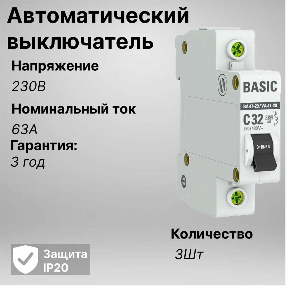 Автоматический выключатель (С) 1P 63А 4,5кА, EKF Basic (комплект 3шт)