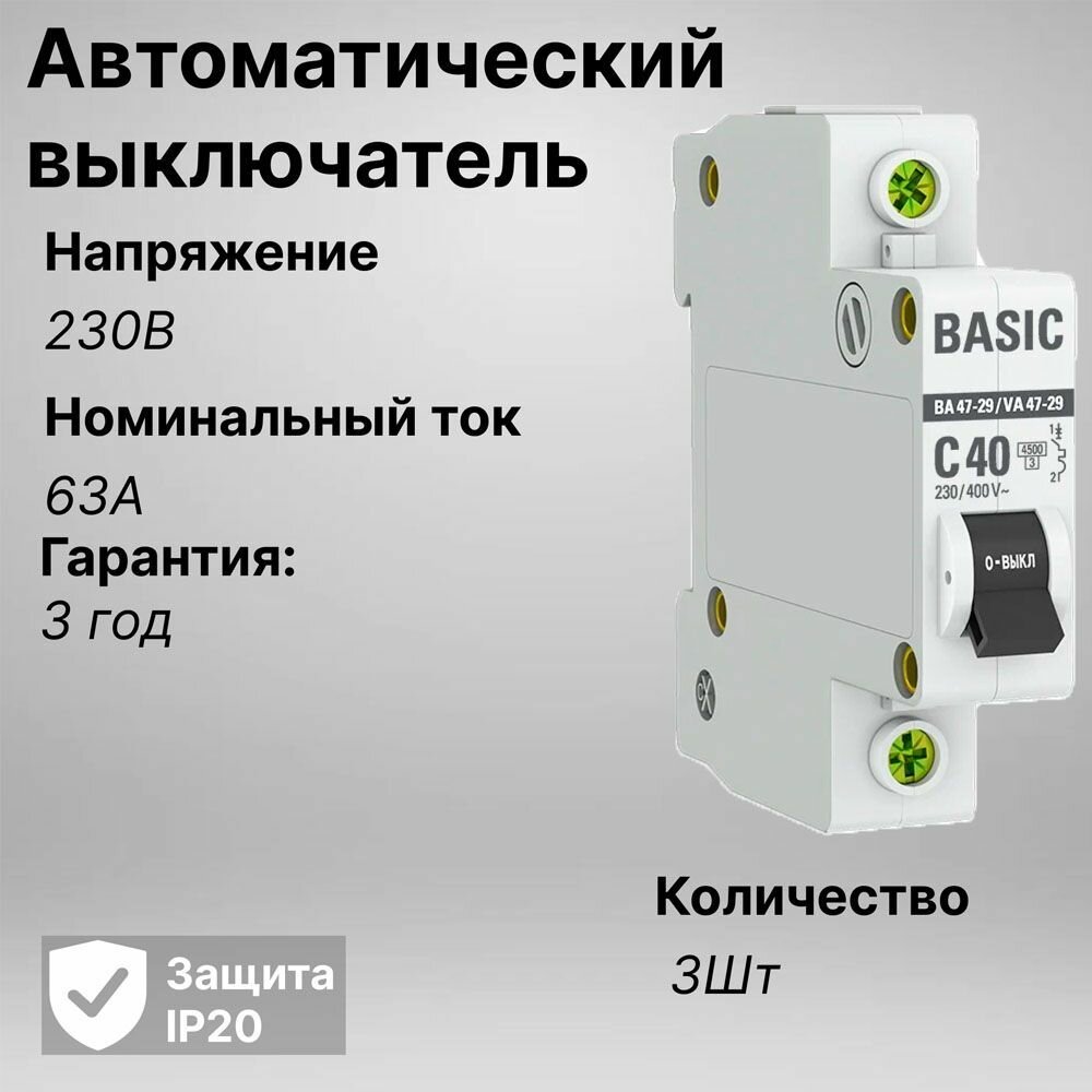 Автоматический выключатель EKF 1P 40А (C) 4,5kA ВА 47-29 EKF Basic 3 штуки информация: