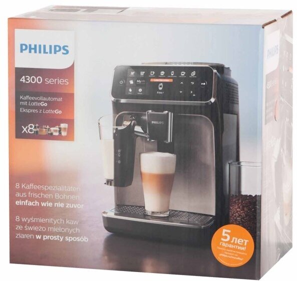Кофемашина Philips 4300 Series EP4341/50 автоматическая, 8 видов кофе, эспрессо-машина с капучинатором LatteGo, сенсорной панелью управления и керамическими жерновами, черный