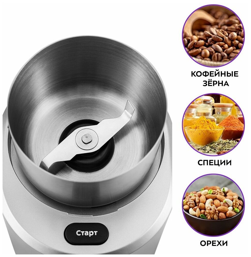 Кофемолка КТ-748, ножевая, 200 Вт, 0.25 л, 70 г, серебристая