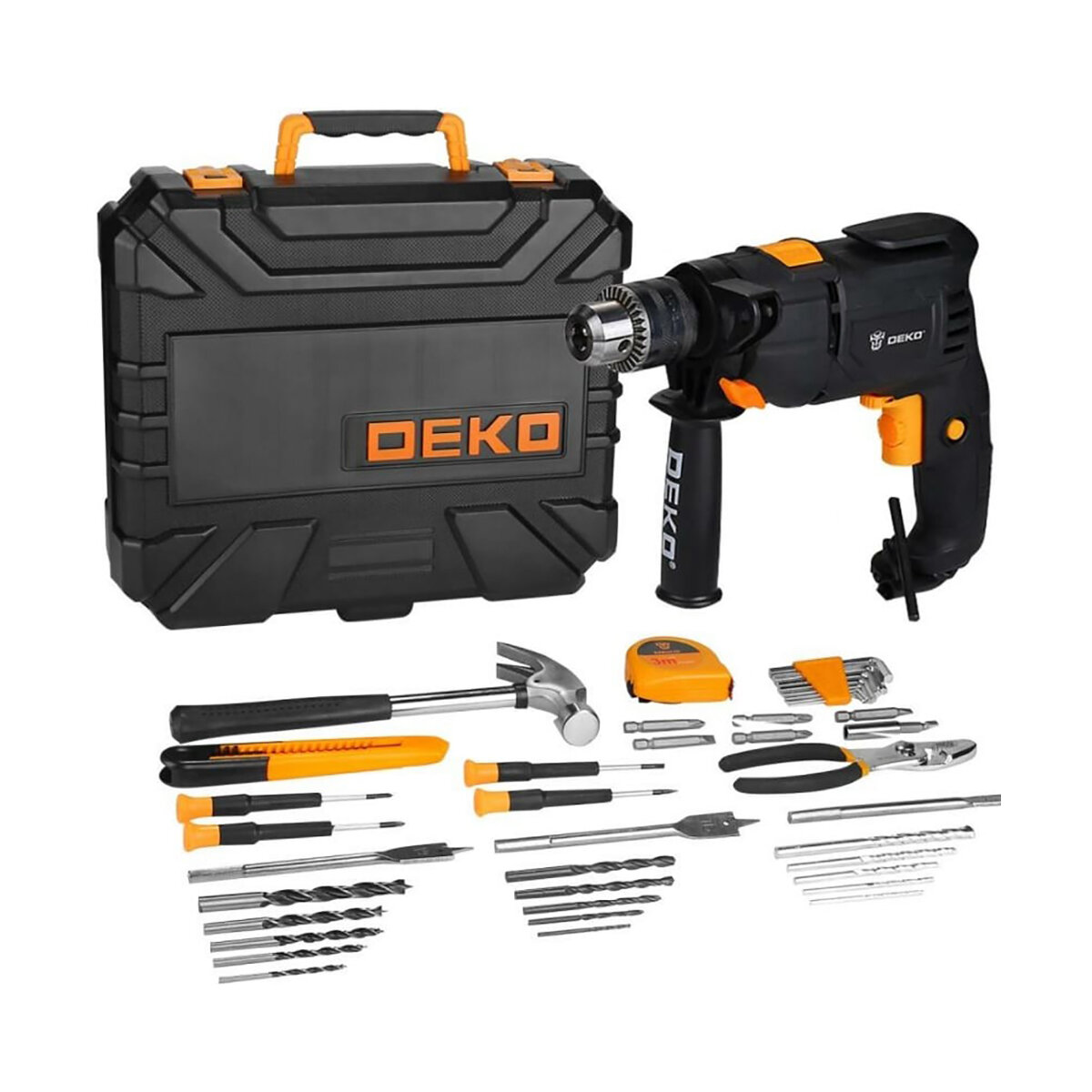Дрель ударная сетевая Deko DKID600W в пластиковом кейсе набор инструментов 40 предметов черно-желтый
