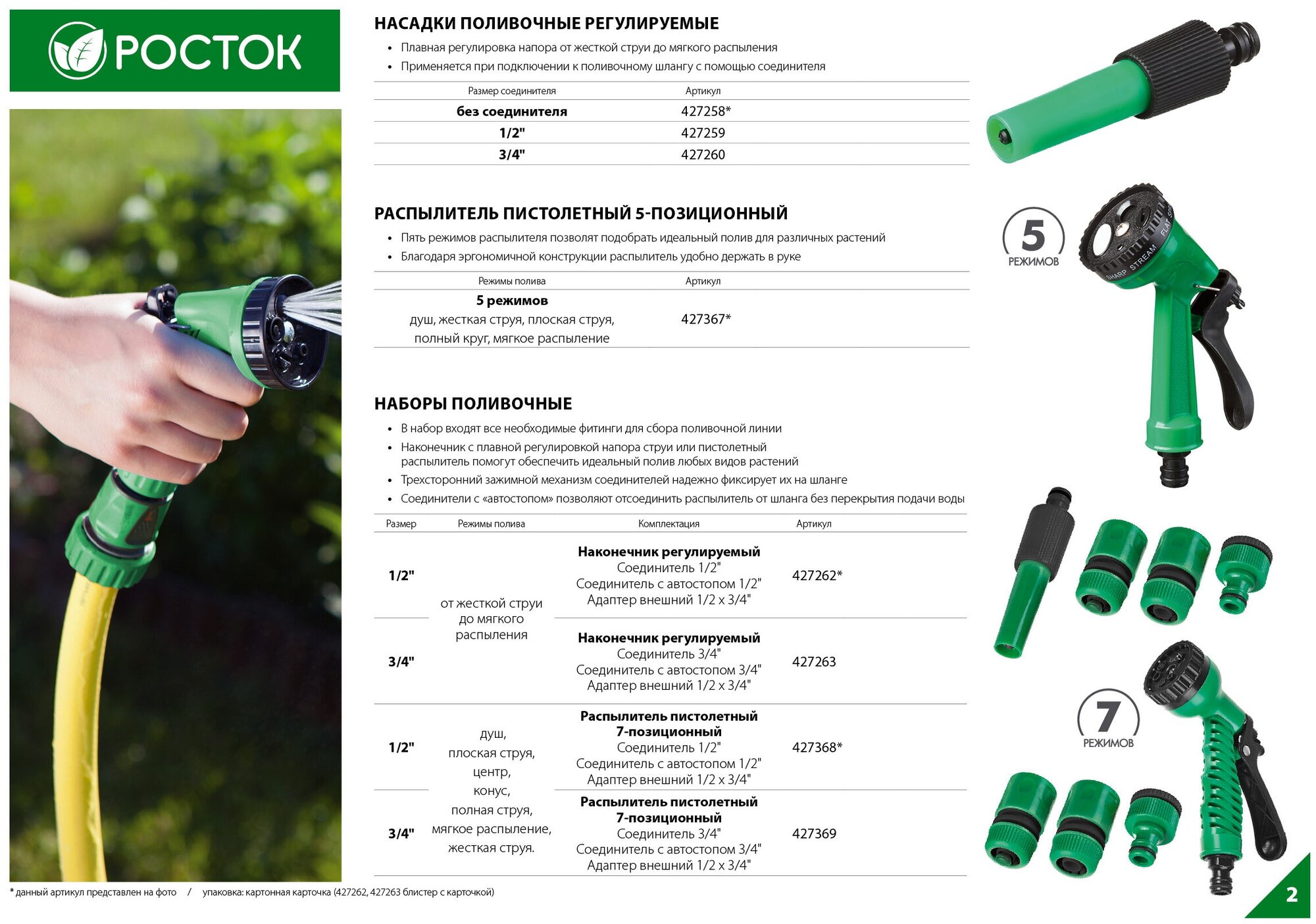 Набор поливочный росток НП-34: пистолет с 7 режимами, комплект соединительной артматуры 3/4″, пластиковый информация: