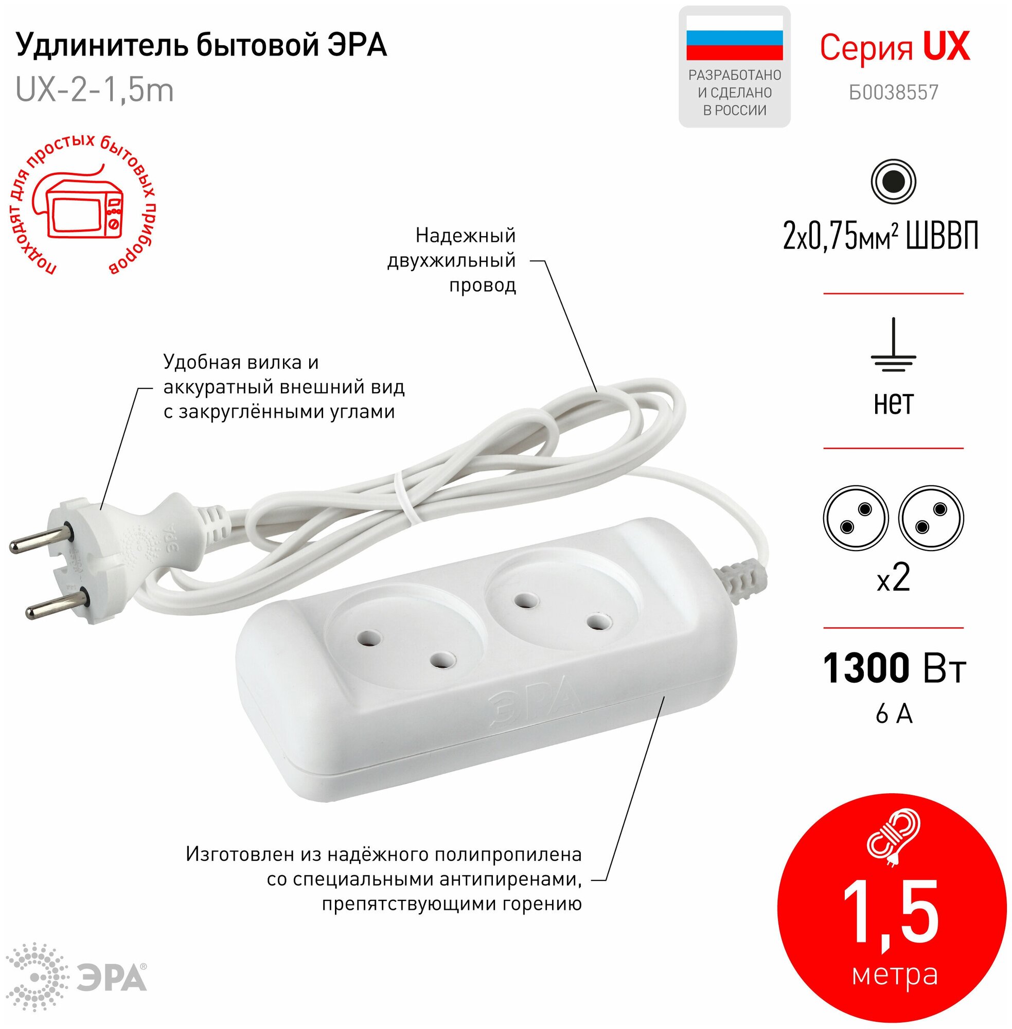 Удлинитель электрический ЭРА UX(6)-2-1,5m без заземления 2 розетки 1,5м ПВС 2x0,75мм² 6А белый арт. Б0038564 (1 шт.)