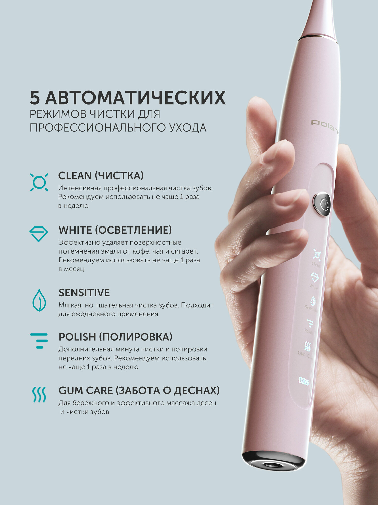 Зубная щетка Polaris PETB 0503 PK/TC, электрическая, максимальная скорость вращения: 48 000 пульсаций/мин., 5 режимов работы, с LED-дисплеем и литиевой батареей на 600 mAh