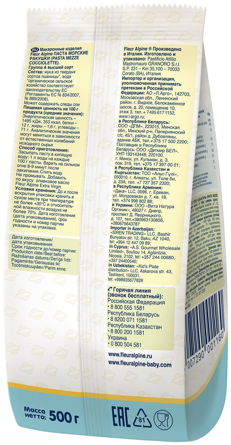 Макароны морские ракушки Fleur Alpine для всей семьи, 500 гр информация: