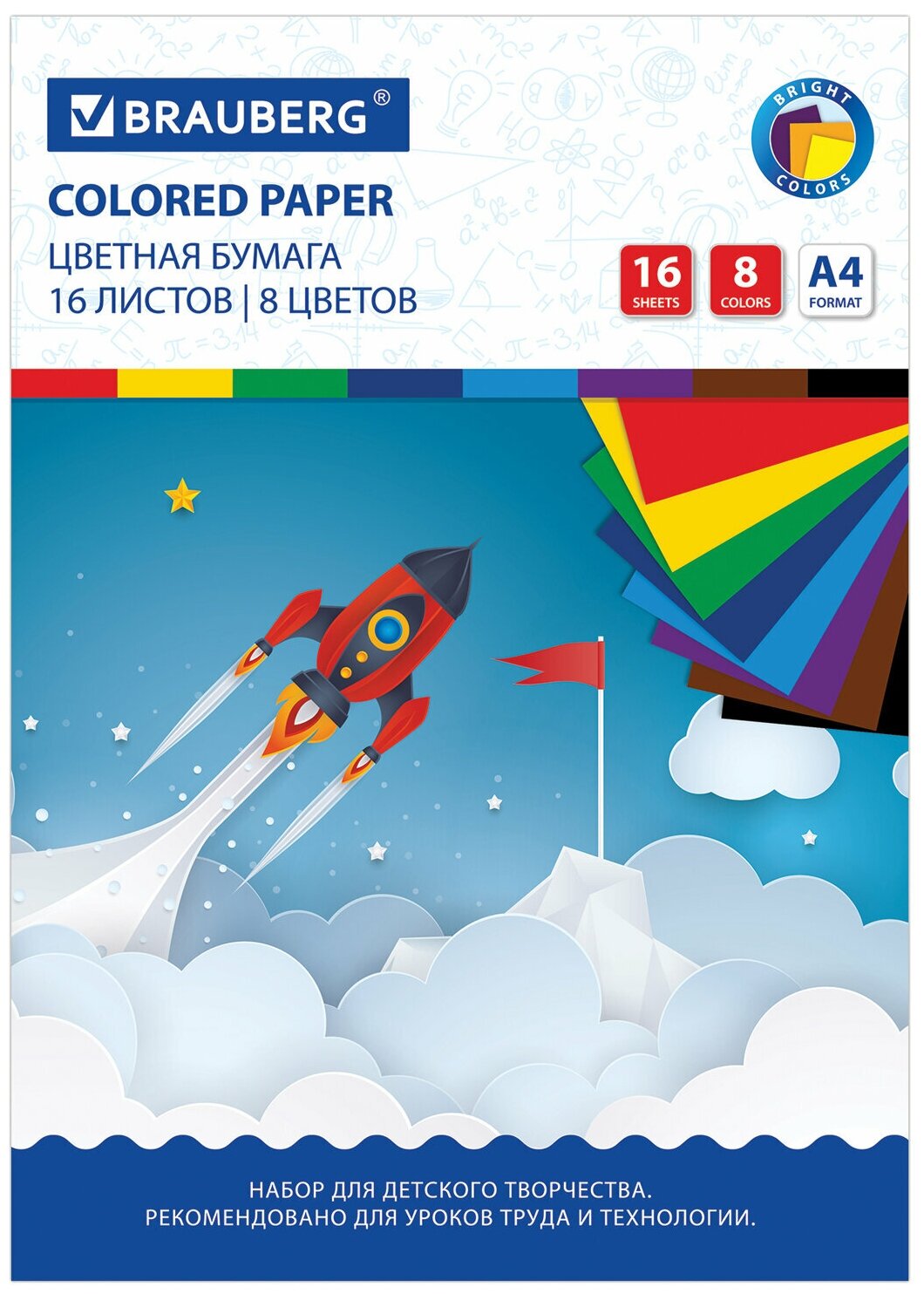 Бумага цветная офсетная Brauberg "Космос" (16 листов, 8 цветов, А4, на скрепке, 200х275мм) (129919) информация: