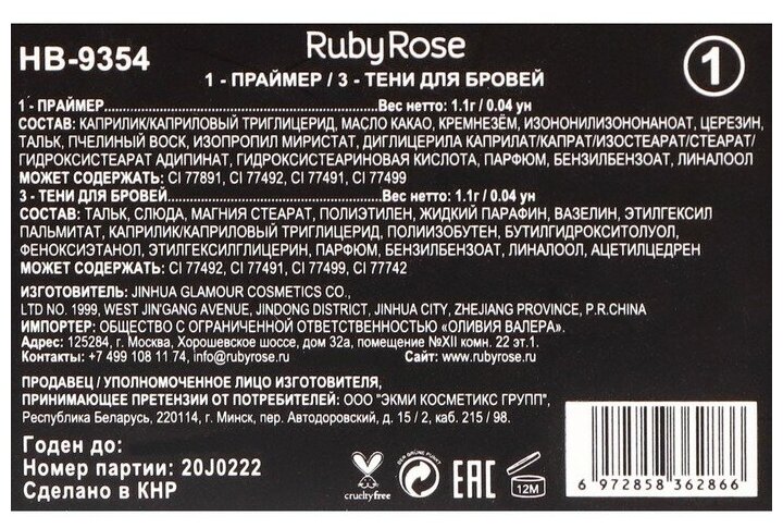 Ruby Rose Палетка для бровей, Ruby Rose , 4 оттенка информация: