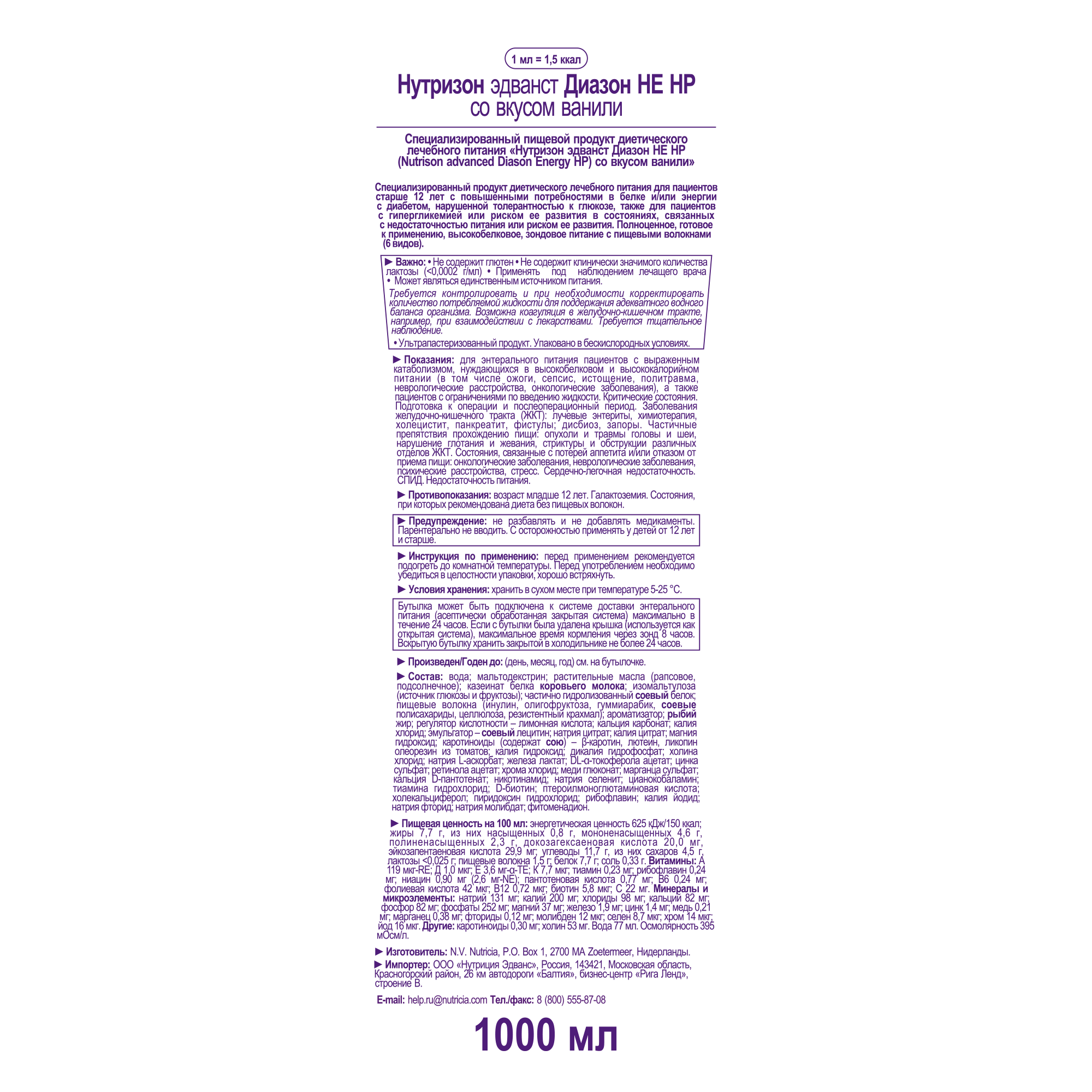 Nutrison Diason / Нутризон Диазон HE HP - жидкая смесь для энтерального питания со вкусом ванили, 1000 мл информация: