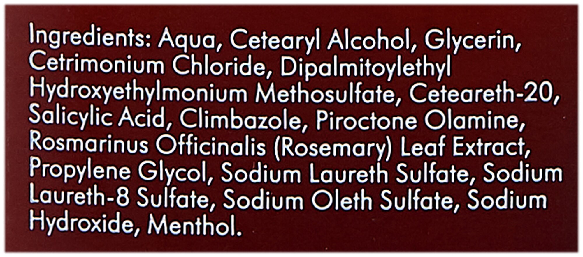 | Состав | вода, цетеариловый спирт, глицерин, цетримония хлорид, дипальмитоэтил гидроксиэтилмония метосульфат, цетеарет-20, салициловая кислота, климбазол, пироктон оламин, розмарин, пропилен гликоль, натрия лауретсульфат, натрия лаурет-8-сульфат, натрия олеатсульфат, натрия гидроксид, ментол |