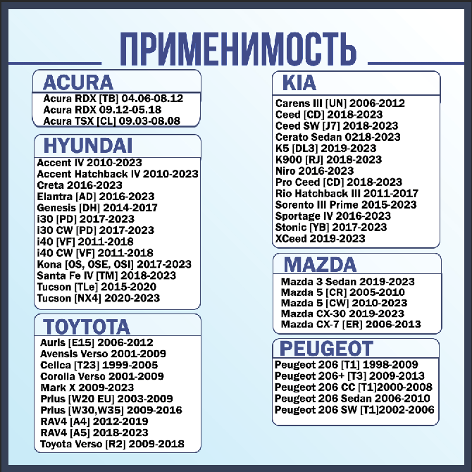 | Совместимость | BMW 8 (18-) Citroen Berlingo (08-) Citroen C3 III (16-) Fiat Punto (12-) Fiat Tipo (15-) Ford Fiesta VI (08-)Kia Carens III (06-), Kia Carnival V (20-), Kia Ceed SW (18-), Kia Cerato (18-), Kia K900 (18-), Kia Pro Ceed (18-), Kia Sorento III (15-), Kia Sportage (16-), Kia XCeed (19-), Acura RDX (06-), Acura RDX (12-), Acura TSX (03-), Chevrolet Cobalt (12-), Genesis G80 (17-), Genesis G90 (16-), Honda Accord 7 (03-), Honda CR-V IV (12-), Honda HR-V (18-), Hyundai Creta (16-), Hyundai Elantra (16-), Hyundai Genesis (14-), Hyundai i30 (17-), Hyundai i40 (11-), Hyundai Santa Fe (18-), Hyundai Solaris (11-), Hyundai Tucson (15-), Infiniti QX50 (13-), Lexus UX (18-), Mazda 3 Sedan (19-), Mazda 5 (05-), Mazda 5 (10-), Mazda CX-30 (19-), Mazda CX-7 (06-), Mazda CX-9 (07-), Nissan Leaf (10-), Nissan Leaf (18-), Nissan Maxima (03-), Nissan Murano (08-), Peugeot 206 (98-), Peugeot 206 (09-), Toyota Auris (06-), Toyota Celica (99-), Toyota Corolla (07-), Toyota Prius (03-), Toyota Prius (09-), Toyota RAV4 (12-), Toyota RAV4 (18-), Toyota Verso (09-) Ford Fiesta VII (12-) Opel Corsa (06-) Opel Corsa (14-) Peugeot 208 (12-) Peugeot Partner (08-) |