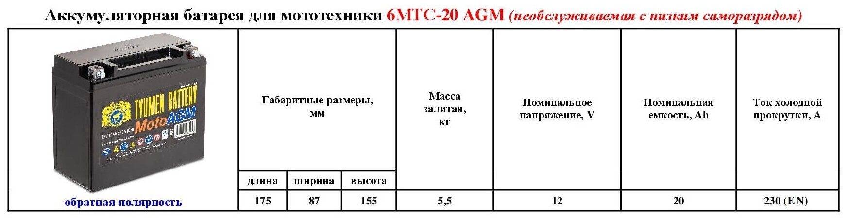 Мотоаккумулятор TYUMEN BATTERY AGM (YTX20L-BS) EN230 обратная информация: