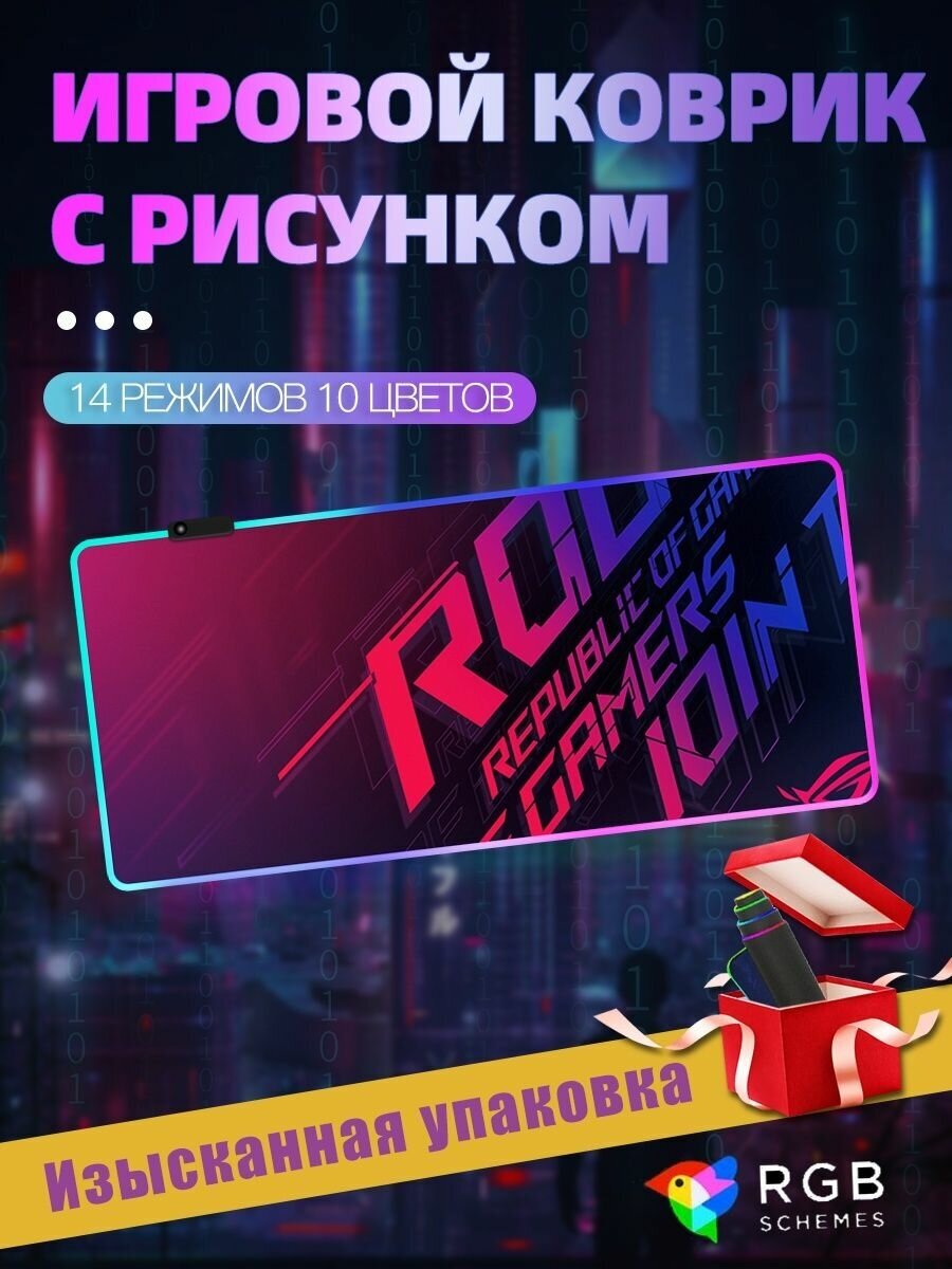 Игровой коврик для мыши с RGB подсветкой 800х300х4 мм, водоотталкивающее покрытие, 14 режимов, коврик для клавиатуры и мыши принт ROG RGB