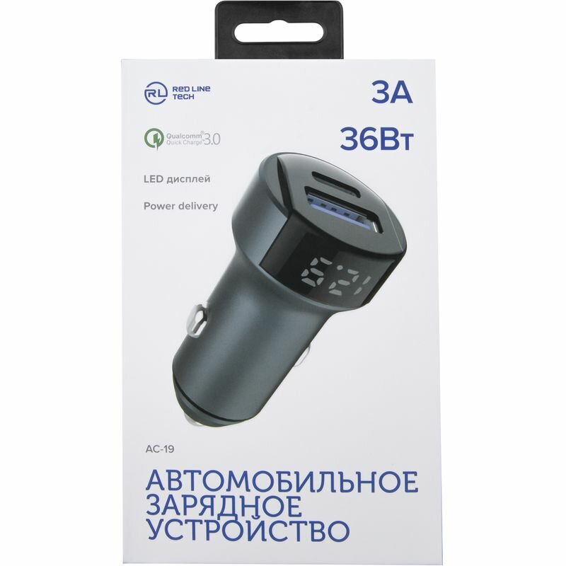 Автомобильное зарядное устройство Red Line Tech USB (QС 3.0 18W) и Type-C (PD 18W) (модель АС-19) 3A серый 562 ₽