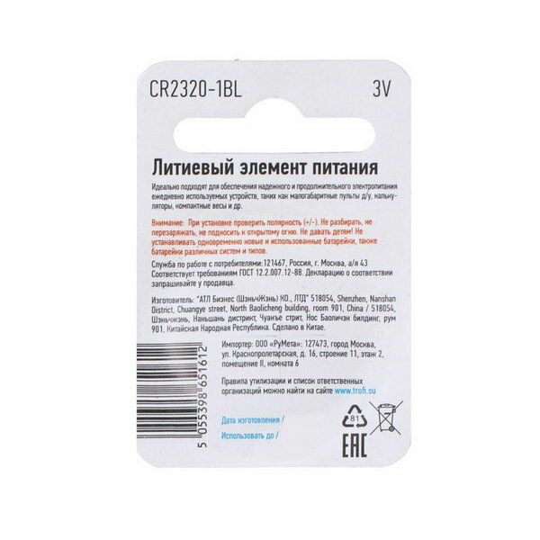 Батарейка литиевая CR2320-1BL, 3В, блистер, 1 шт. информация: