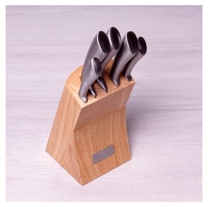 | Комплектация | нож для чистки овощей (лезвие 9 см, рукоятка 10,5 см); нож универсальный (лезвие 12 см, рукоятка 11 см); нож "Сантоку" (лезвие 16 см, рукоятка 13,5 см); нож для мяса (лезвие 20 см, рукоятка 13,5 см); нож "Шеф-повар" (лезвие 20 см, рукоятка 13,5 см); подставка из дерева. |