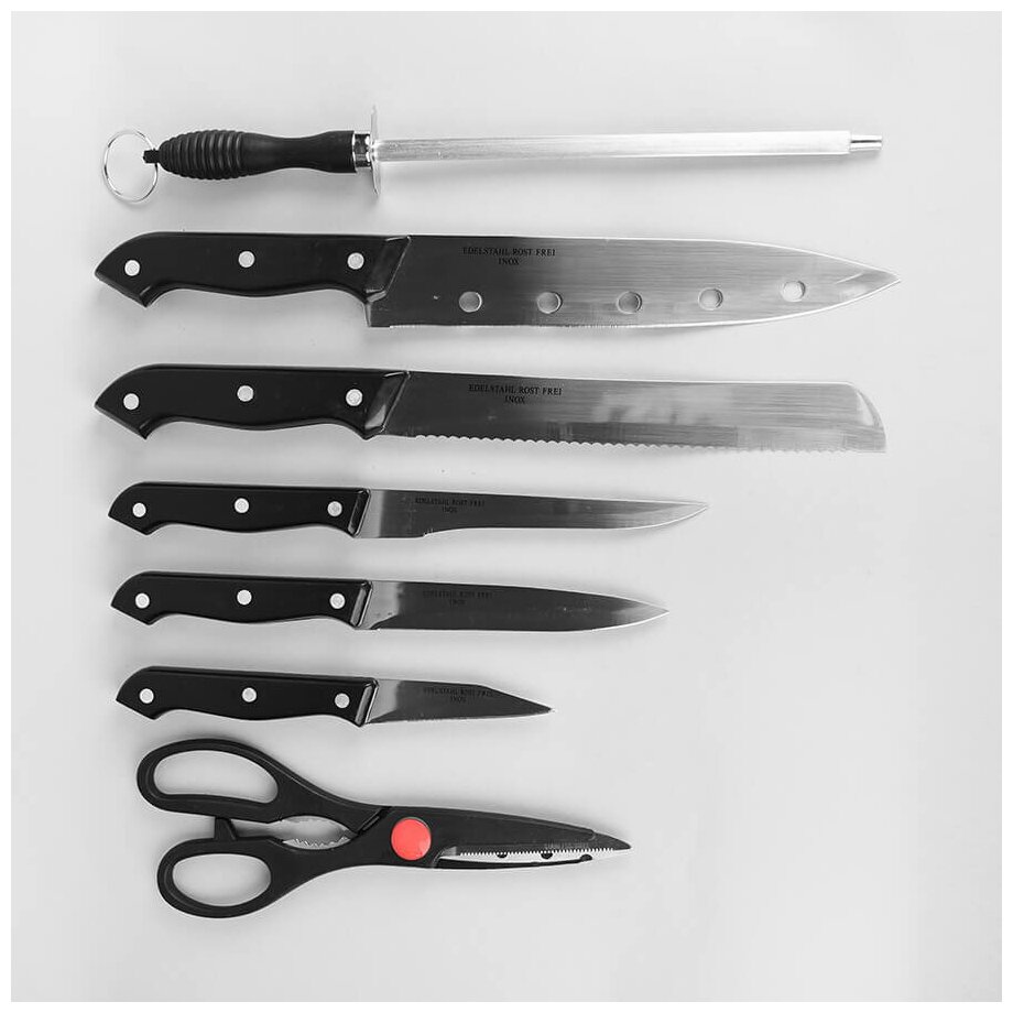 | Комплектация | подставка для ножей, поварской нож, нож для мяса, универсальный нож,нож для хлеба, нож для чистки овощей, кухонные ножницы, мусат для заточки ножей |