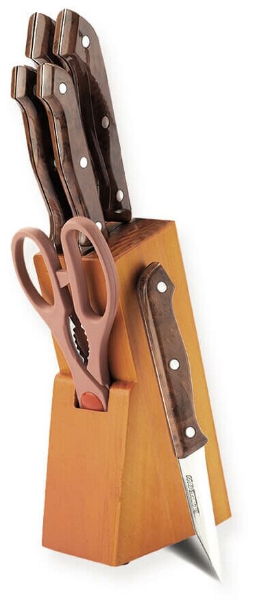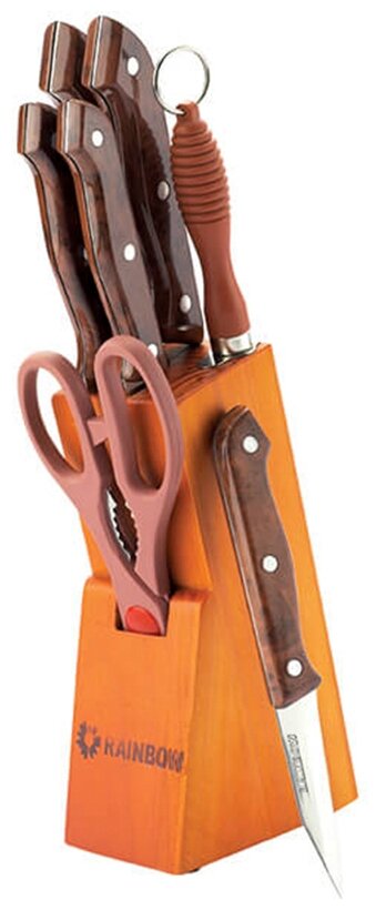 | Комплектация | подставка для ножей, поварской нож, нож для мяса, универсальный нож,нож для хлеба, нож для чистки овощей, кухонные ножницы, мусат для заточки ножей |