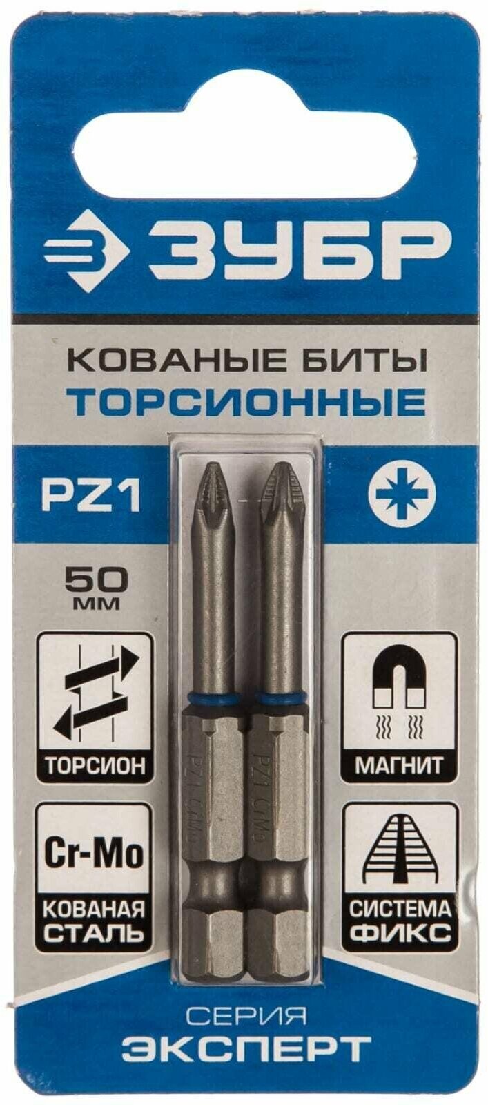 Биты ЗУБР ″эксперт″ PZ1 x 50 мм., торсионные кованые, обточенные, хромомолибденовая сталь, 2 шт. (26013-1-50-2)