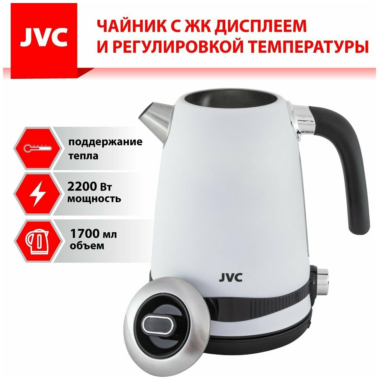10 цен на Чайник электрический JVC 1.7 л с дисплеем, 7 уровней температуры нагрева 40-100 градусов, подставка с вращением на 360 градусов, 2200 Вт