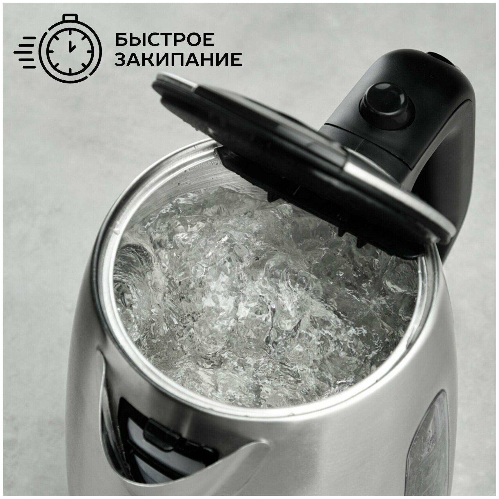 Электрический чайник, объем 1.8 Л, автоматическое открытие крышки, мощность 1850-2200 Вт, большое окно для контроля уровня воды, внутренняя подсветка