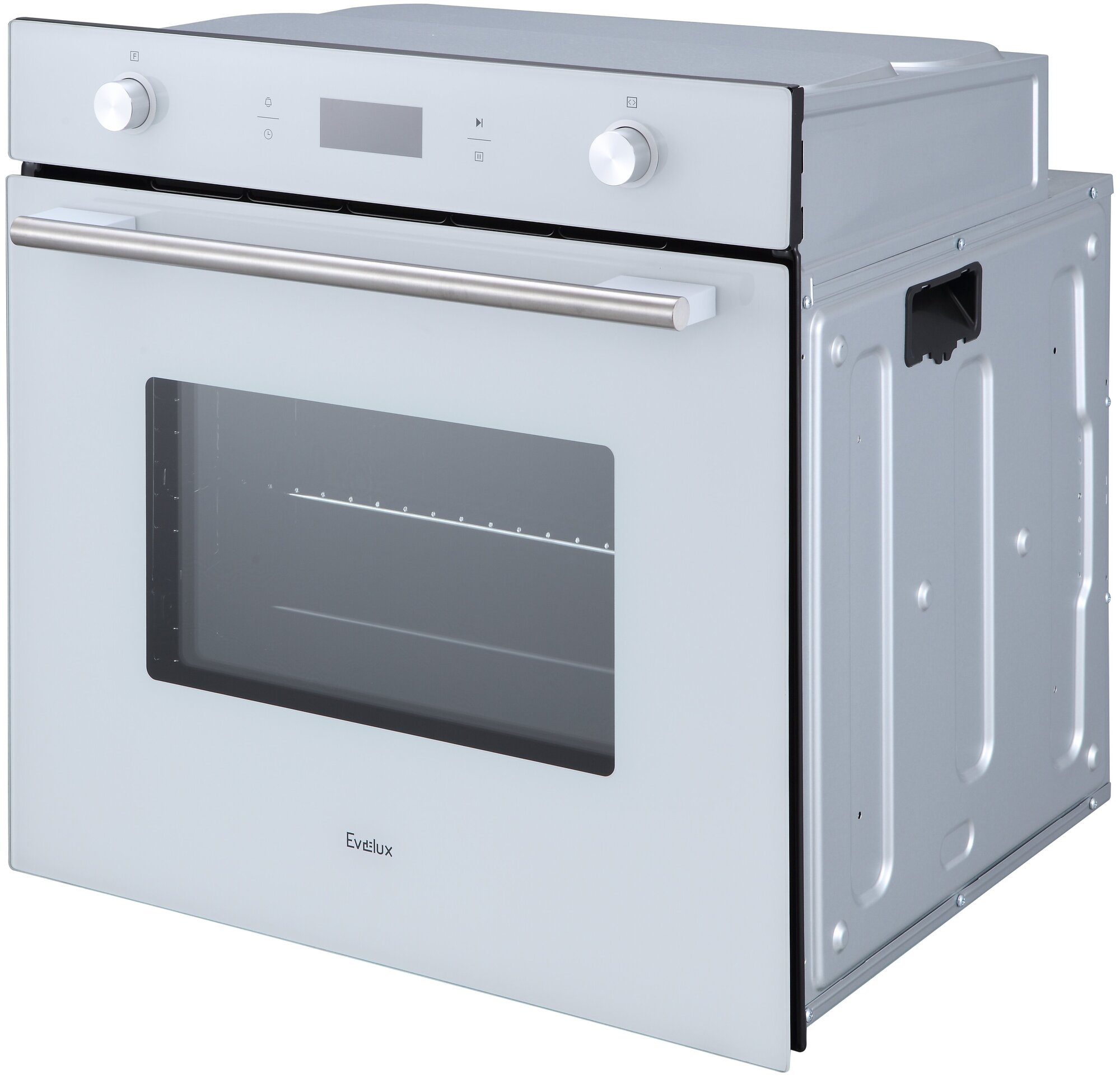 Встраиваемая газовая духовка EVELUX встраиваемый полноразмерный, 60 см, 9 режимов, объем духовки 70л, утапливаемые переключатели, большой дисплей Snow White, хромированные боковые решетки, телескопические направляющие 1 уровнь, панель управления - белое с