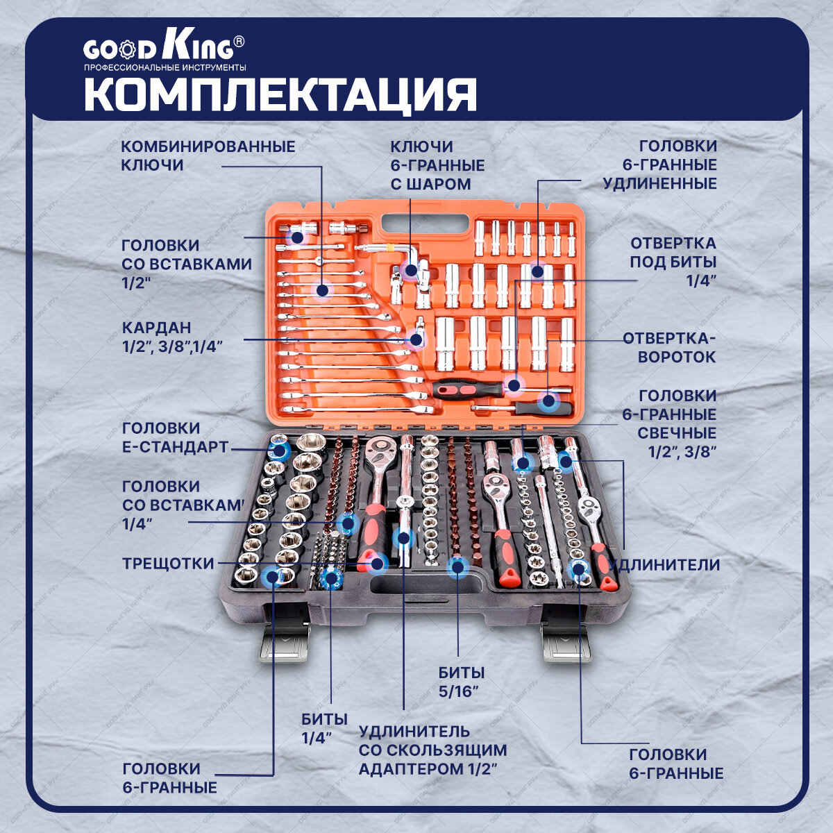 Набор инструментов GOODKING 216 предметов 1/2", 3/8", 1/4" K-10216
