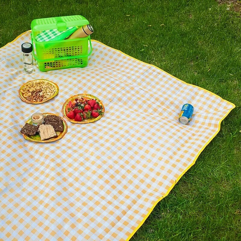 10 цен на Коврик сумка для пикника и пляжа складной 200х150 см водонепроницаемый непромокаемый влагостойкий для гальки; сумка лежак для пляжа; желтая клетка