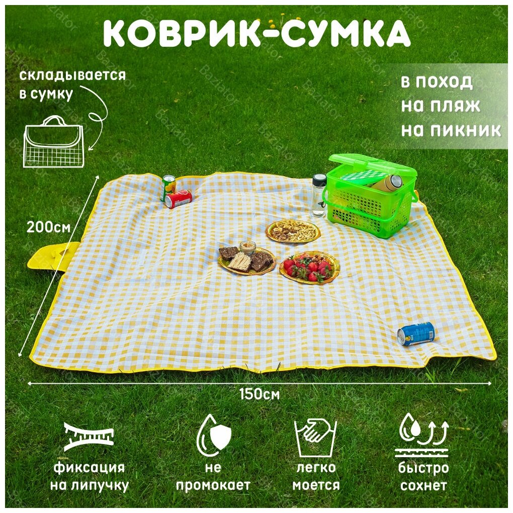 Коврик сумка для пикника и пляжа складной 200х150 см водонепроницаемый непромокаемый влагостойкий для гальки; сумка лежак для пляжа; желтая клетка информация:
