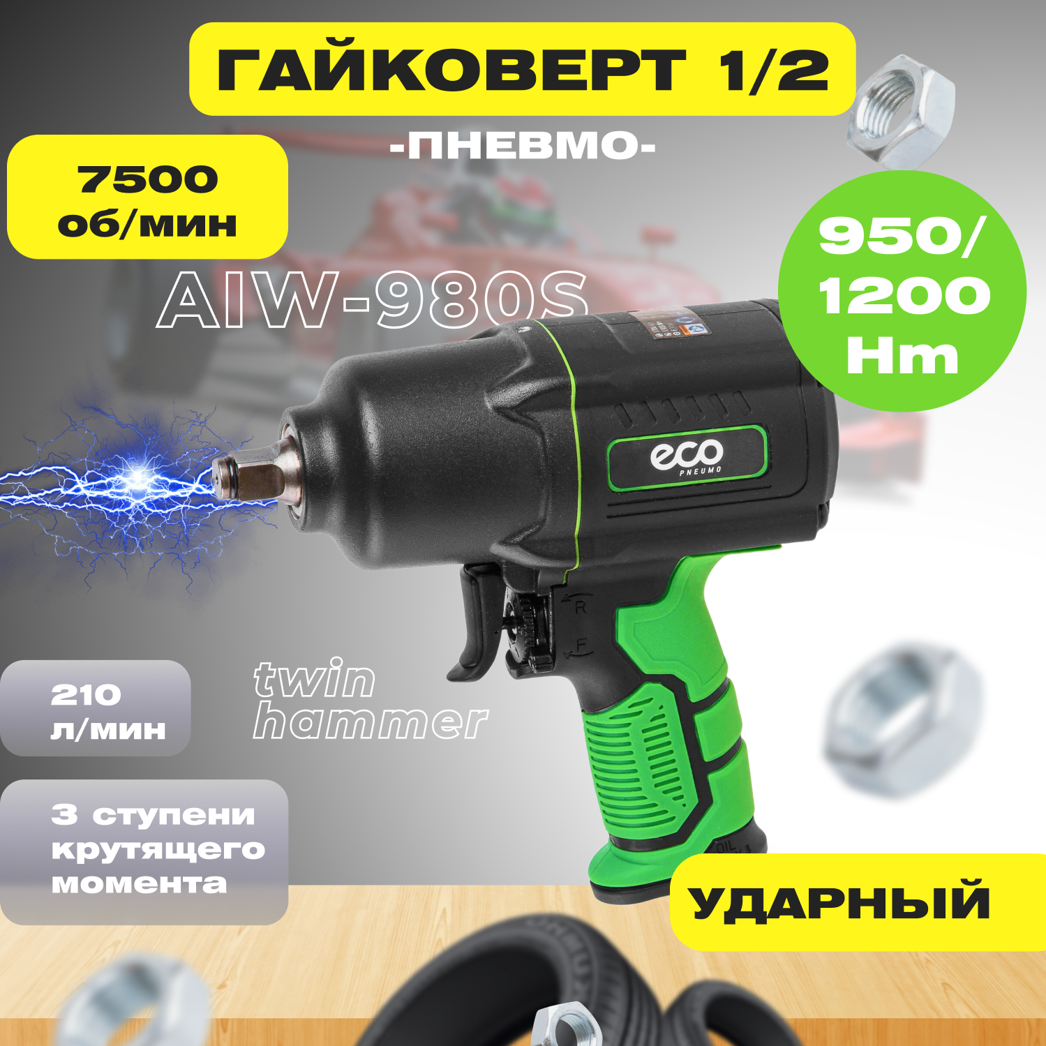 Пневмогайковерт 1/2" ECO AIW-980S (950/1200 Нм (закр./откр.), 3 ступени крут.мом., twin hammer, 7500 об/мин, композитн. корпус)