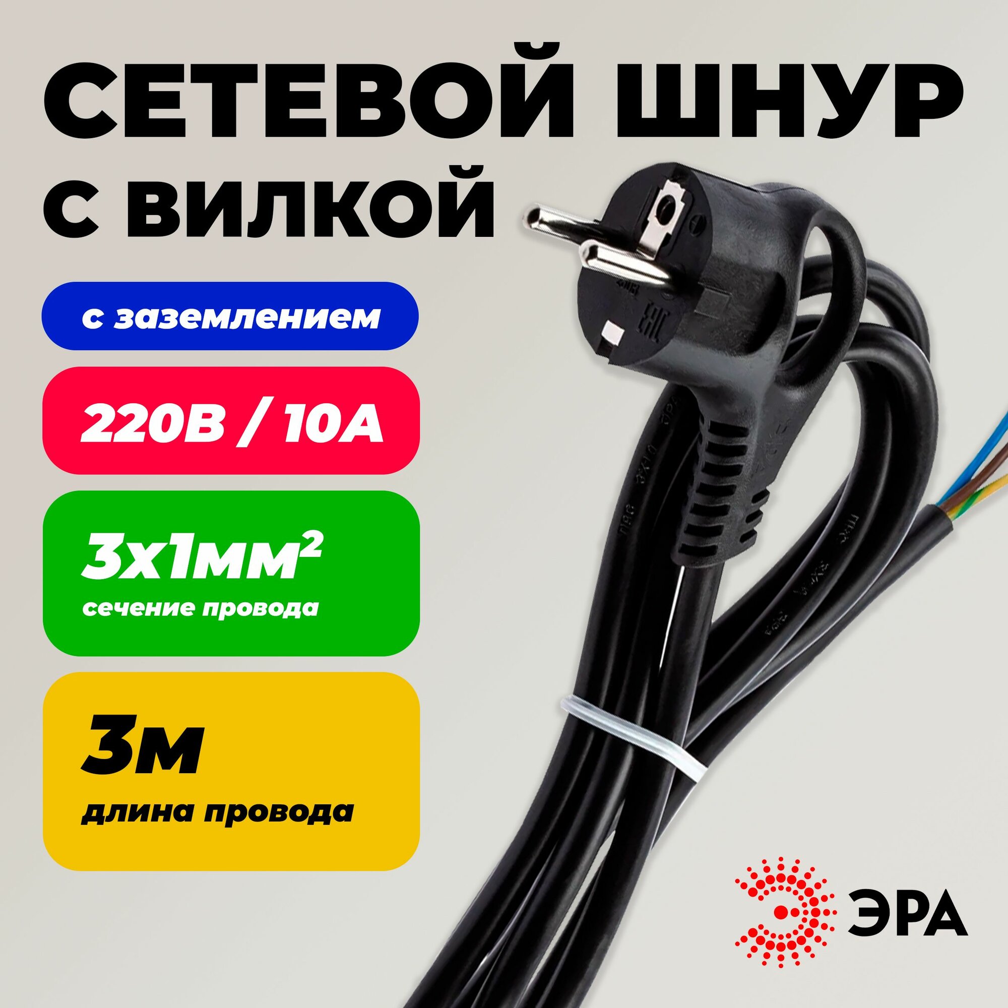 Отзывы на Сетевой шнур с вилкой ЭРА U3x13mB с заземлением 3м ПВС 3x1мм2 черный Б0048701
