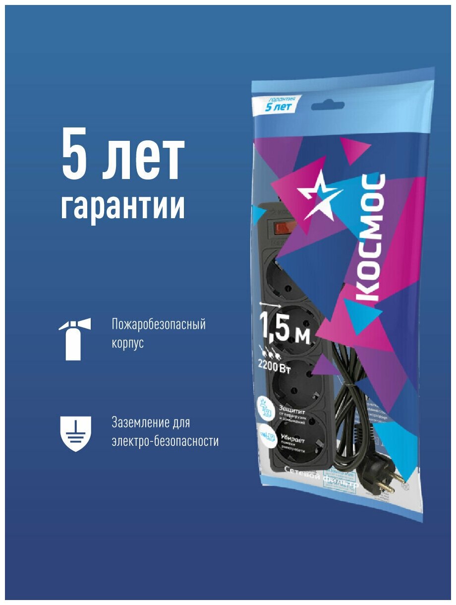 Сетевой фильтр Космос 1 5 м 4 розеток пвс 3х0 75мм2 черный