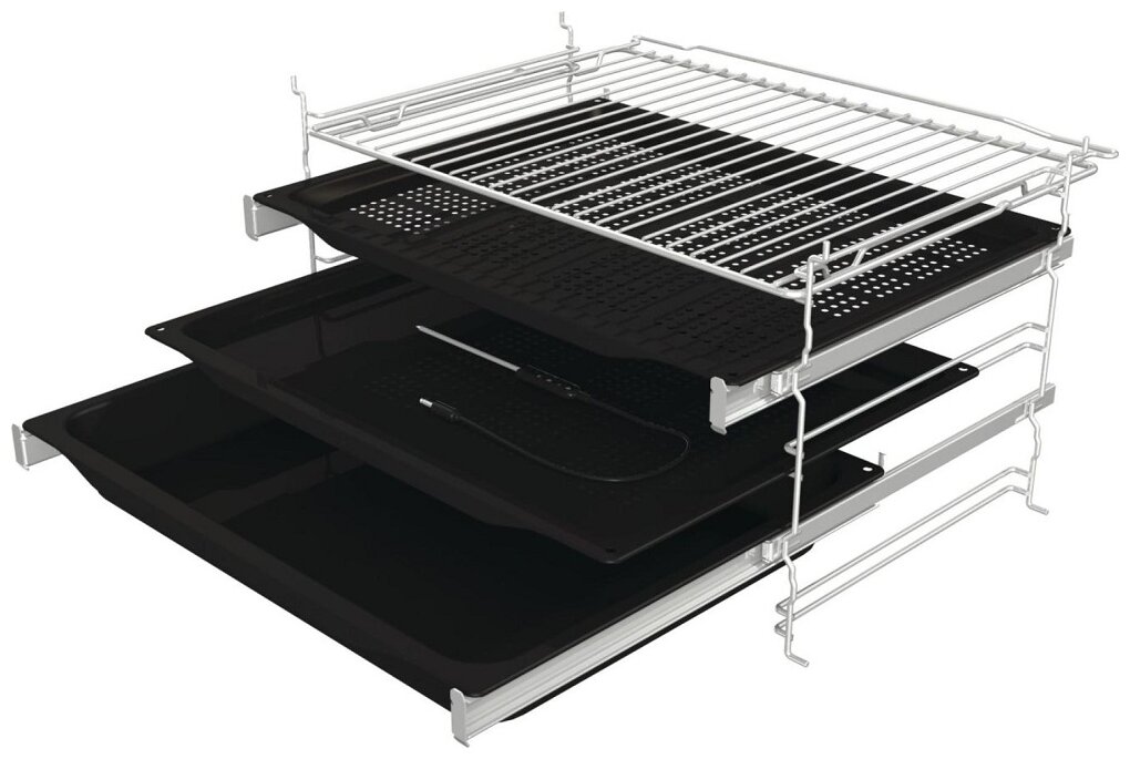 | Подробная комплектация | частично выдвижные телескопические направляющие на 2-х уровнях, глубокий эмалированный противень, мелкий эмалированный противень, решетка, термозонд для мяса |