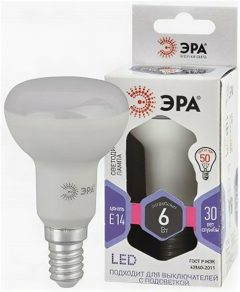 Отзывы на Светодиодная LED лампа ЭРА стандарт R50 E14 6W(500lm) 6000K 6K 88х50 R50-6W-860-E14 9119 (упаковка 10 штук)