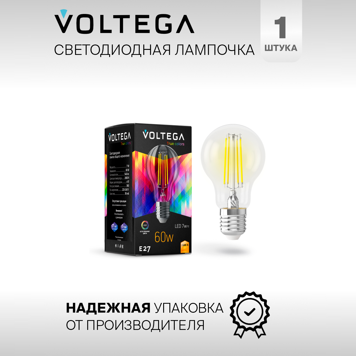 Лампочка светодиодная E27 форма груша 7W теплый свет Voltega Crystal A60 2800K упаковка 6 штук 1 507 ₽