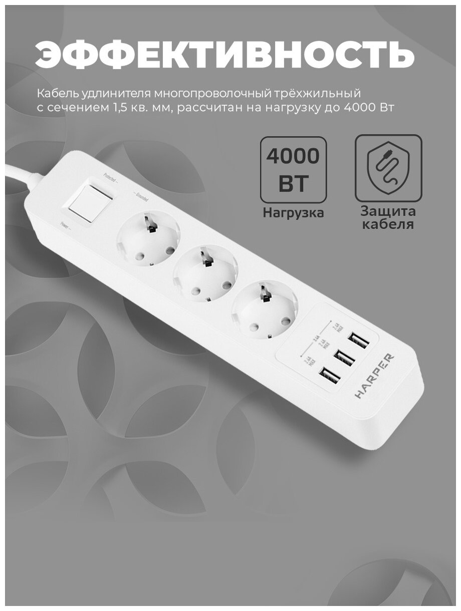 Сетевой фильтр HARPER UCH-360, 3 розетки, 3 м, с/з, 16А / 4000 Вт белый информация: