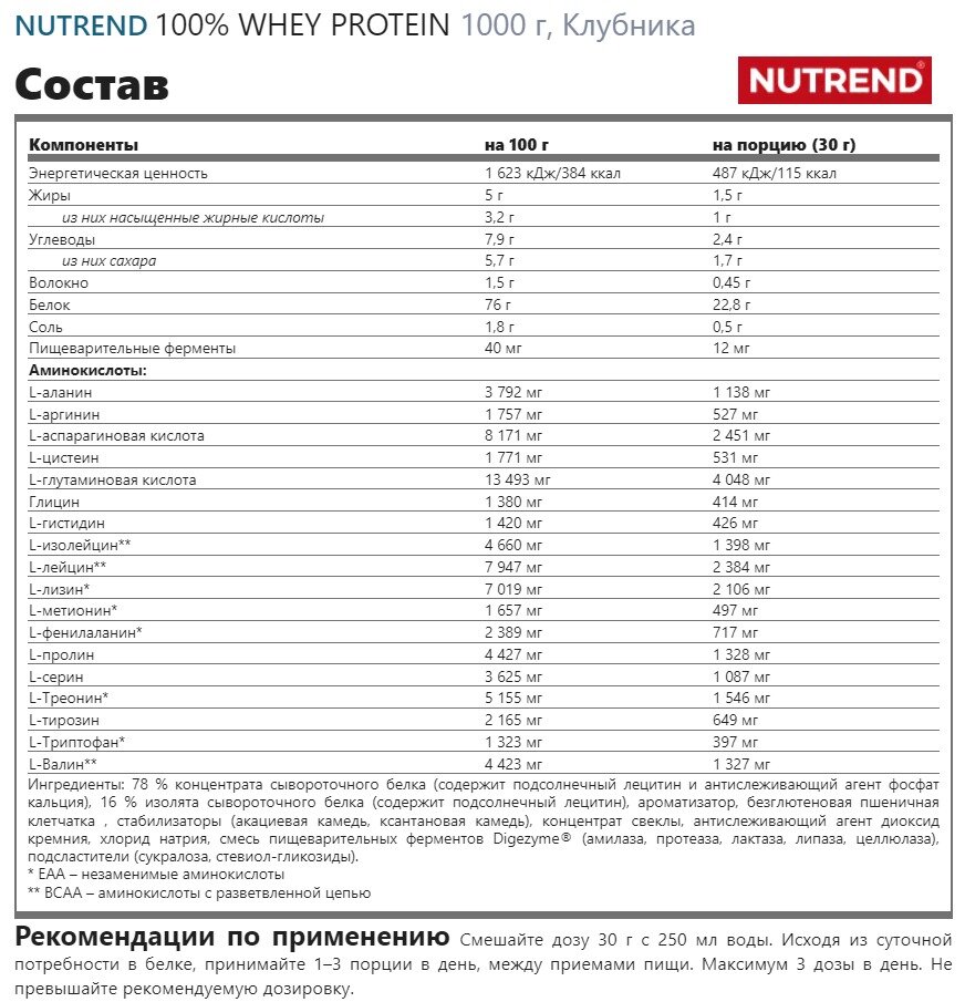 Сывороточный протеин NUTREND 100% WHEY PROTEIN 1000 г, Клубника информация: