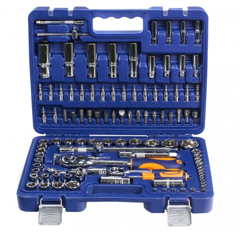 | Головки торцевые подробно | 1/4" (6-гр.): 4, 4.5, 5, 5.5, 6, 7, 8, 9, 10, 11, 12, 13, 14 мм; длинные 1/4": 6, 7, 8, 9, 10, 11, 12, 13 мм; Torx 1/4": E4, E5, E6, E7, E8; удлинитель 1/4": 50, 100 мм; карданный шарнир 1/4"; трещотка 1/4": 45 зубов; вороток т-образный 1/4": 110 мм; с битами 1/4": T8, T10, T15, T20, T25, T27, T30, H3, H4, H5, H6, SL4, SL5.5, SL6.5, PH1, PH2, PZ1, PZ2; 1/2" (6-гр.): 10, 11, 12, 13, 14, 15, 16, 17, 18, 19, 20, 21, 22, 24, 27, 30, 32 мм; длинные 1/2": 14, 15, 17, 19, 22 мм; Torx 1/2": E10, E12, E14, E16, E18, E20, E22, E24; свечные 1/2": 16, 21 мм; карданный шарнир 1/2"; удлинитель 1/2": 125, 250 мм; трещотка 1/2": 45 зубцов |