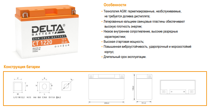 Аккумулятор DELTA BATTERY DELTA CT 1220 обратная полярность 20 Ач информация: