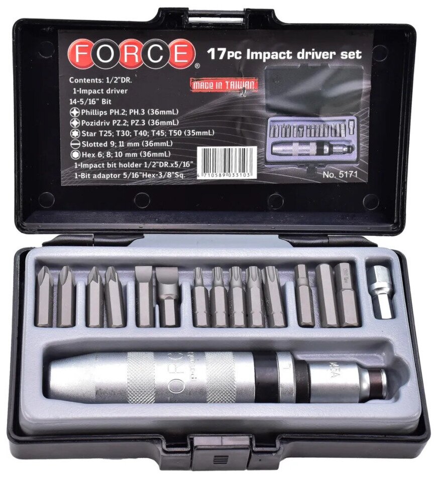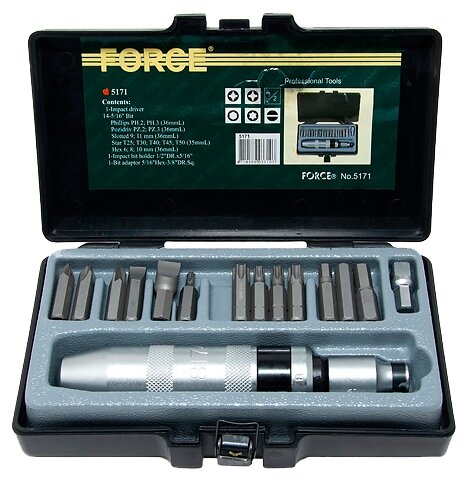 Отвертка ударная с комплектотом насадок Force 5171, 17 предметов 5 099 ₽