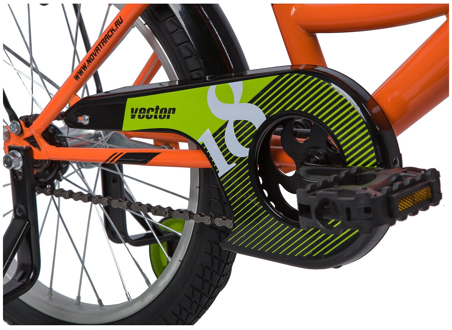 Велосипед NOVATRACK 18" VECTOR, оранжевый, защита А-тип, тормоз нож., крылья и багажник чёрн. информация: